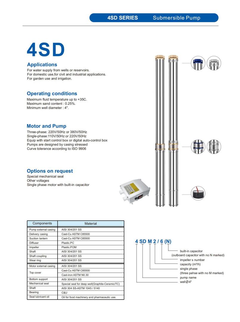 SD submersible water pump for deep well is a high-efficiency fluid transfer equipment specially tailored for deep well water extraction scenarios. It adopts an integrated submersible structure design, with pump casing made of AISI 304/201 stainless steel and impeller made of plastic. POM.