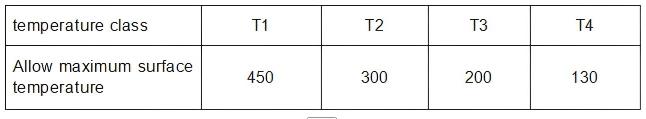 This explosion-proof submersible sewage electric pump is marked as ExdIIBT4/ExdIICT4, designed for use in IIB/IIC-class factories where combustible gas or steam-air explosive mixtures exist in temperature groups T1-T4. The unit's maximum surface temperature must comply with the specifications in the table below.